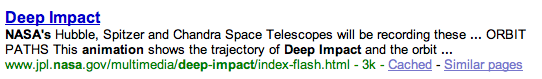 改进之后搜索结果中的Flash网站, 搜索查询 [nasa deep impact animation]