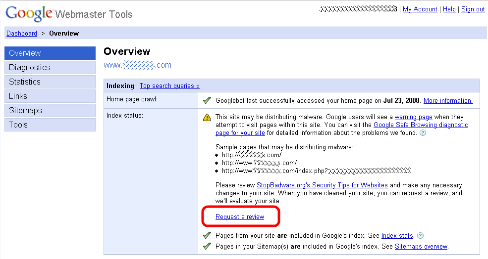 3.最后,如果您认为您的网站排名在某种程度上受到了恶意软件的影响,比如您网站上被侵害的内容违反了我们的网站管理员指南(例如您被黑掉的网页含有指向某药店网站的隐藏链接),您应该填写并提交一份重新审核的申请。这里需要说明的是,重新审核的申请通常适用于因违反网站管理员指南而引起的问题,与恶意软件评估请求的适用条件是有区别的。如果您有其他问题,请查阅我们的相关帮助文档,或在阻止恶意软件讨论组(译者注:该讨论组为英文讨论组)发帖求助。我们希望网站管理员工具的这项新增功能可以帮助您更好地发现和修复与恶意软件有关的问题。